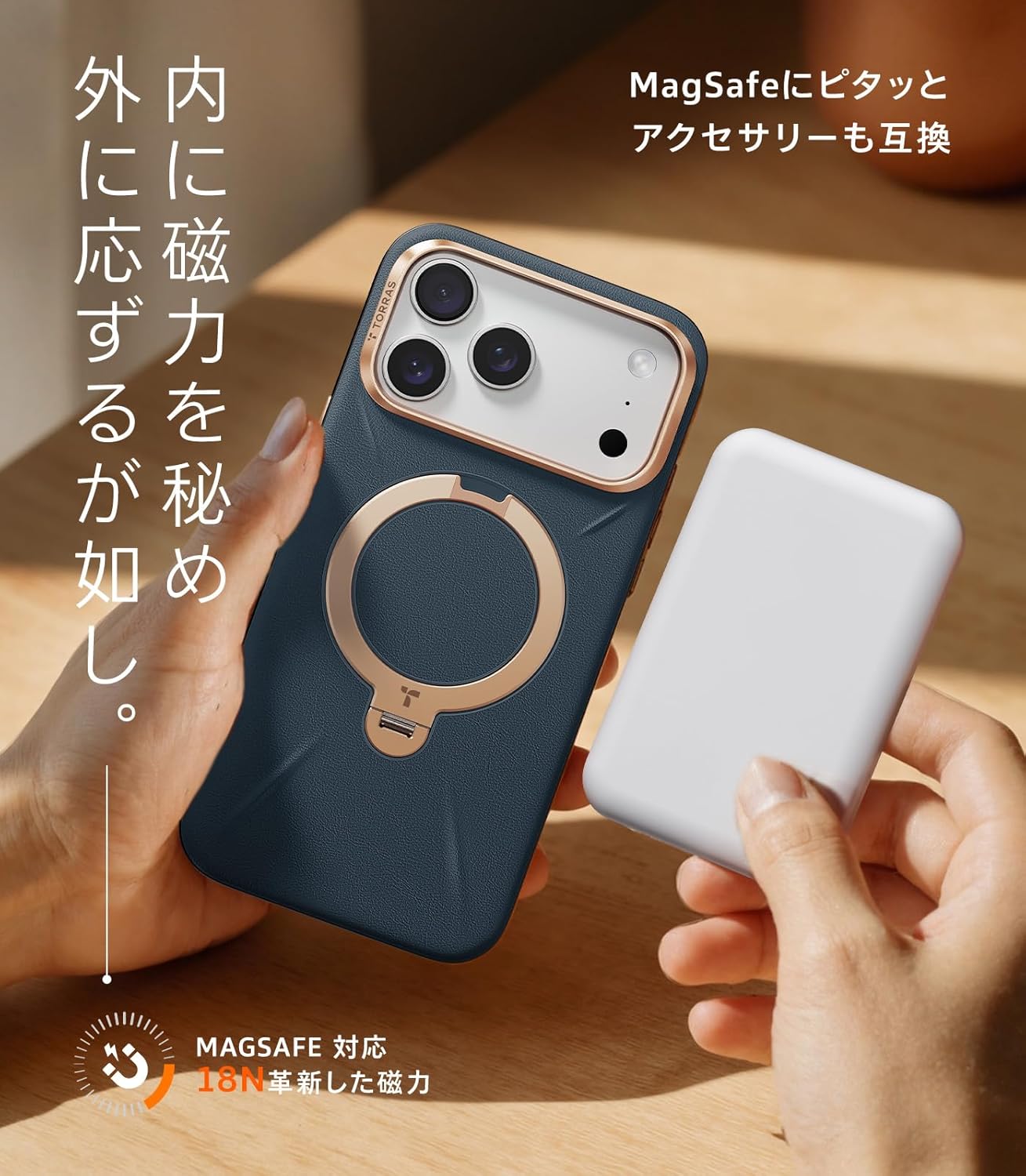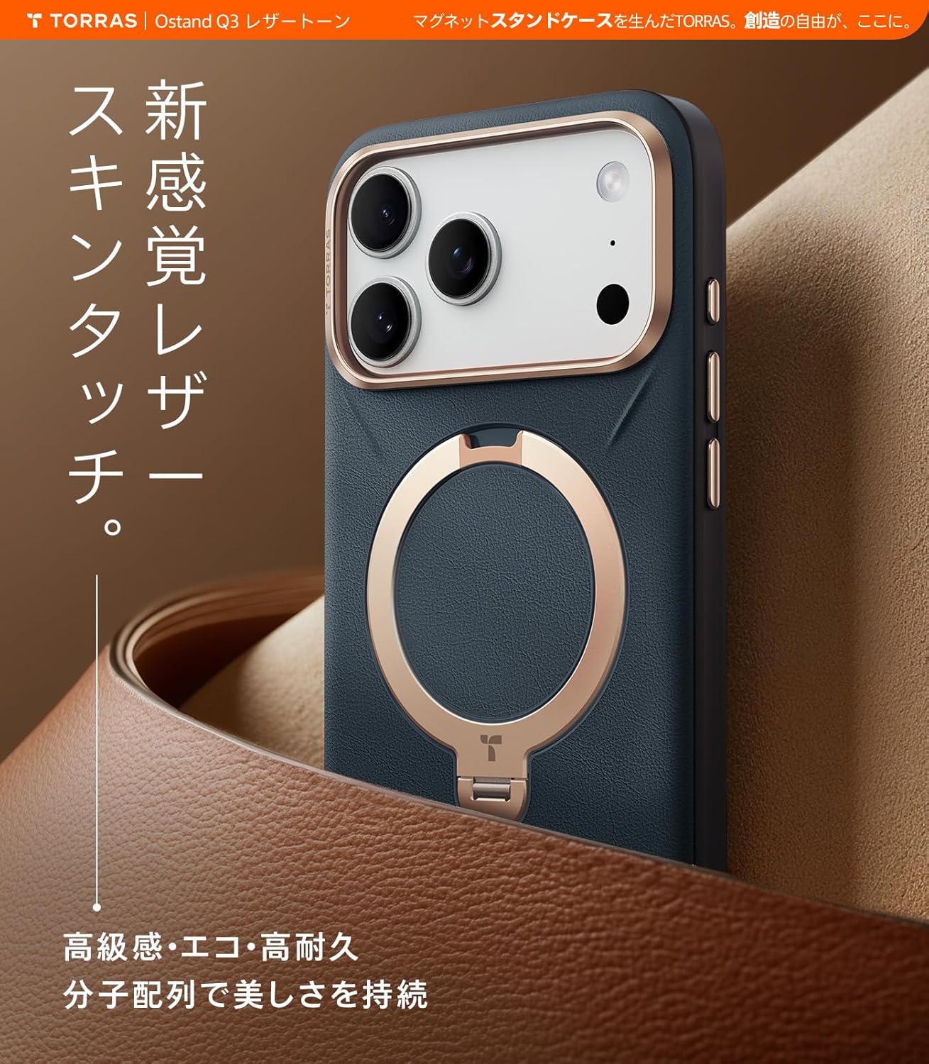 TORRAS iPhone 17 Pro 用 ケース【新感覚レザー・スキンタッチ】Ostand Q3 レザートーン MagSafe対応 リング スタンド 360°定点回転 縦横両対応 マグネット搭載 革 カメラコントロールボタン 米軍規格 耐衝撃 指紋防止 サファイア・ディープブルー Amazonで販売中