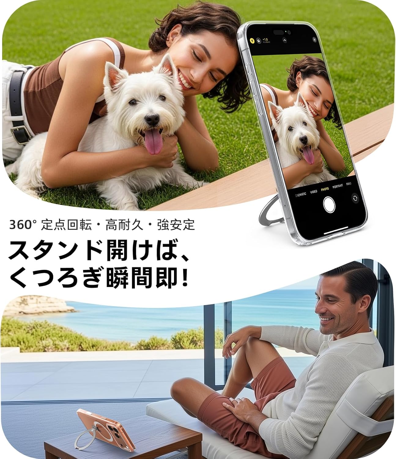 【縦横両安定対応・家族みんなが手放せない】Ostand Q3 Spin は使い始めたら手放せない!金属ギアの「カチッ」音で角度がしっかりロックされ、横にしても縦にしても安定だ。自宅でご飯を食べながら横向きに少し傾ければ、野球中継やアニメも画面で見逃さず;通勤中は指輪で手に固定し、急ブレーキでも落ちない。キッチンでは縦向き 90° に直立させればレシピもはっきり見える。年配の方は卓上に横向きに置いて手が疲れず、「カチッ」で簡単調節;子供は指輪で横向きに持っても落ちないので安心。5000 回以上の開閉に耐え、キズや指紋に強い —— 横も縦も自在に使えるこんな安定感のあるケースを拒む人はいない。