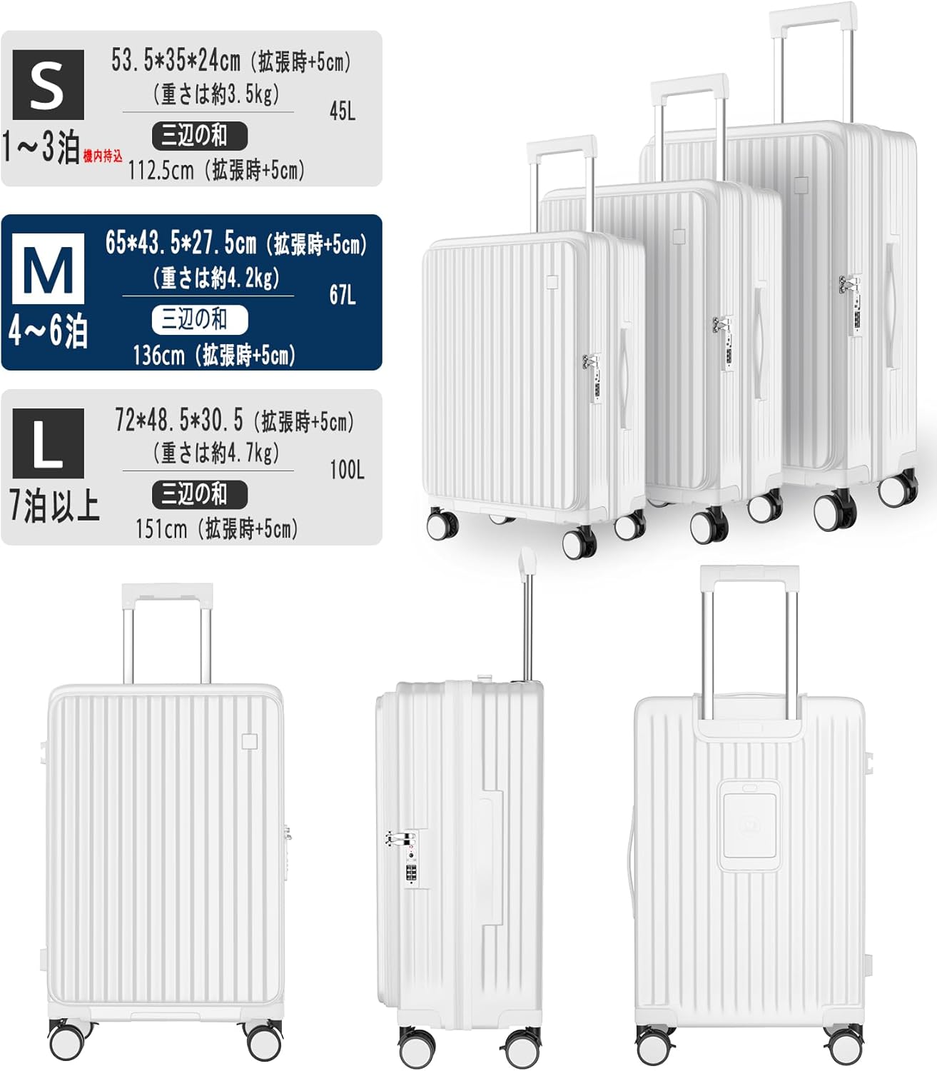 【片開き・拡張可能・大容量タイプ】片面開きなので狭い場所でも完全に開けずに出し入れが可能で、占有スペースを50%削減します、開けるときも片手で楽々。ファスナータイプで、マチ幅を5cm拡張するだけで容量が20%UPできる。旅先でお土産が増えても安心です。※拡張時は機内持ち込み不可