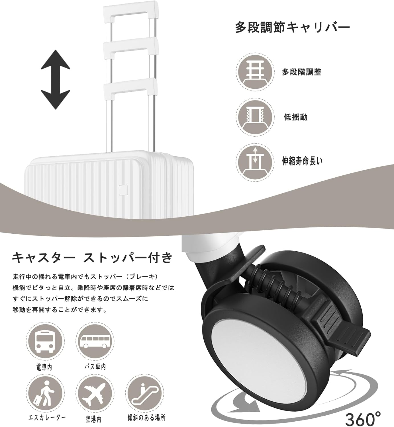 【多機能・キャスター ストッパー付き ・USB+Type C充電ポート付き ・カップホルダーとスマホルダーを付く】走行中の揺れる電車内でもストッパー(ブレーキ)機能でピタっと自立。乗降時や座席の離着席時などではすぐにストッパー解除ができるのでスムーズに移動を再開することができます。スーツケースにモバイルバッテリーを収納するポケットがついており、 USB+Type Cポートの充電口が外にあることで、いつでもどこでも充電できます。便利な折りたたみ式ドリンクホルダー付き。バックカップホルダー、ミルクティーカップ、傘いつでも配置でき、旅行をより便利にすることができます。レバーの上部にはスマホルダーが付いているので、フライトの待ち時間に両手が自由になり、外出先でもリラックスできます。