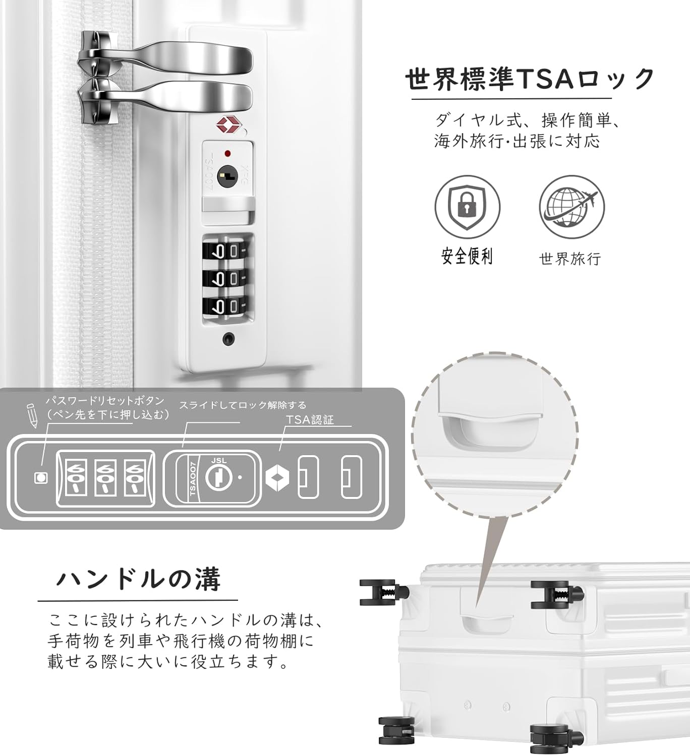 【三段調節キャリバー・世界基準の安全性】超軽量のアルミニウム製キャリバー、高さ三段階調節、ご自分の身長に合わせてスムーズに調整が可能です。耐振性に優れるデザインで荷物を引きかける時、しっかりしています。また、滑りにくいソフトハンドルで長い時間の手提げでも手は疲れません。海外旅行には欠かせないTSAダイヤル方式のロックが搭載されており、外出がより安全になります。※鍵は航空会社検査専用のため本製品には付属しておりません。