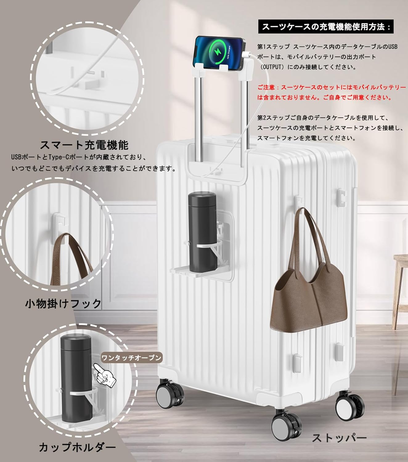 【多機能・キャスター ストッパー付き ・USB+Type C充電ポート付き ・カップホルダーとスマホルダーを付く】走行中の揺れる電車内でもストッパー(ブレーキ)機能でピタっと自立。乗降時や座席の離着席時などではすぐにストッパー解除ができるのでスムーズに移動を再開することができます。スーツケースにモバイルバッテリーを収納するポケットがついており、 USB+Type Cポートの充電口が外にあることで、いつでもどこでも充電できます。便利な折りたたみ式ドリンクホルダー付き。バックカップホルダー、ミルクティーカップ、傘いつでも配置でき、旅行をより便利にすることができます。レバーの上部にはスマホルダーが付いているので、フライトの待ち時間に両手が自由になり、外出先でもリラックスできます。
