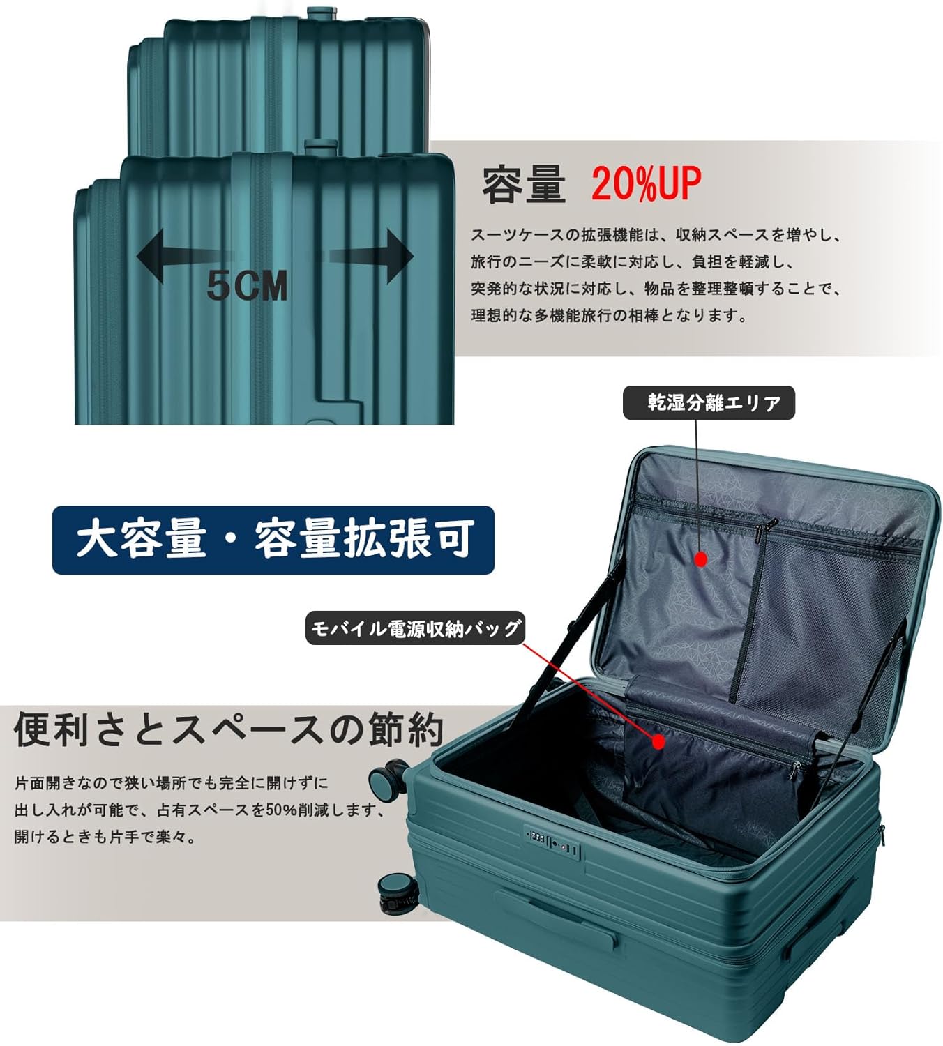 【片開き・拡張可能・大容量タイプ】片面開きなので狭い場所でも完全に開けずに出し入れが可能で、占有スペースを50%削減します、開けるときも片手で楽々。ファスナータイプで、マチ幅を5cm拡張するだけで容量が20%UPできる。旅先でお土産が増えても安心です。※拡張時は機内持ち込み不可