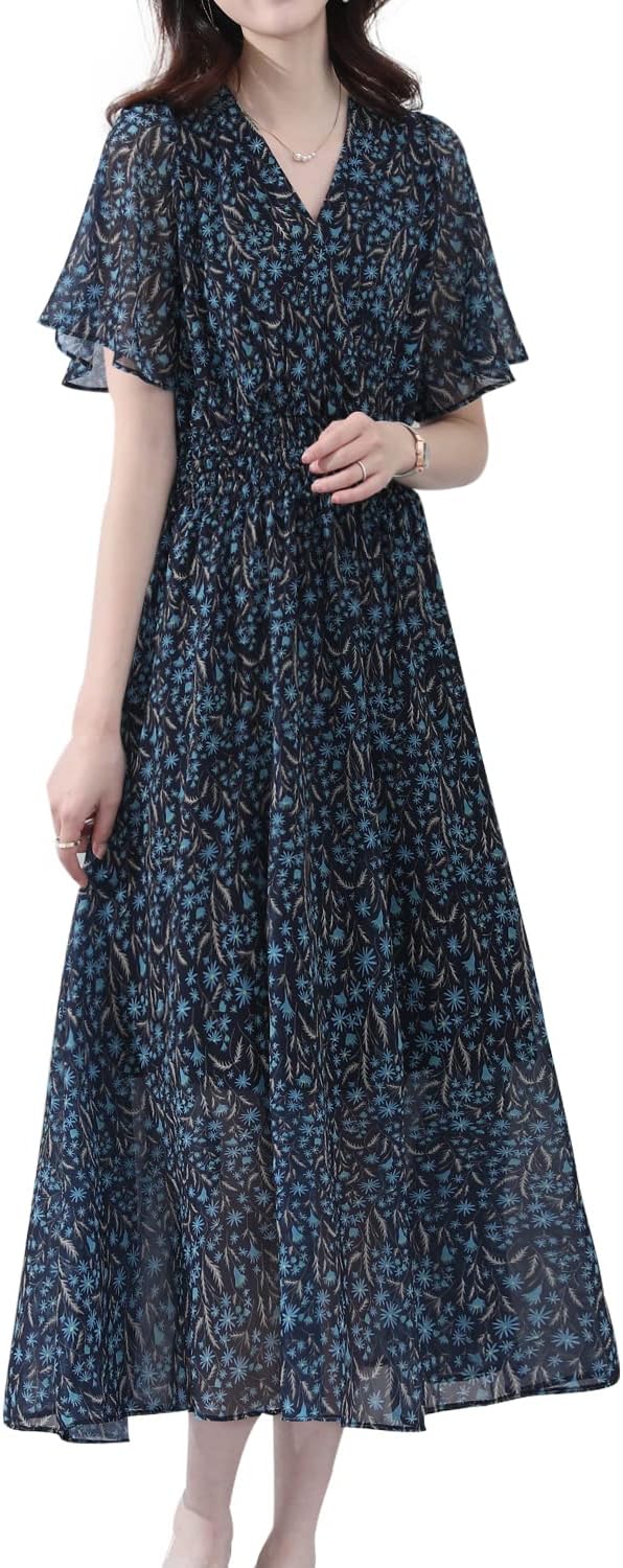 [Yino] 花柄 ロング ワンピース 半袖 レディース シフォン マキシワンピース Vネック フレア袖 裏地付き ウエストゴム 着痩せ おしゃれ 可愛い お呼ばれ お出かけ 通勤 普段着 夏 Amazonで販売中