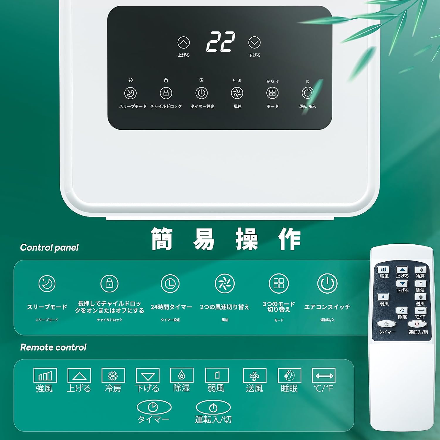 [3-in-1運転機能]スポットエアコン:冷風/送風/ドライ・冷風温度設定範囲:16~32℃・タイマー:1~24時間・おやすみ設定・リモコン付・キャスター付・便利な窓パネル付き